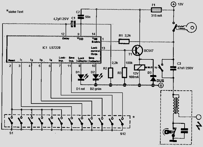 Die Schaltung besteht, was die Elektronik betrifft, aus einem speziellen IC, dem LS7220, das direkt aus dem Bordnetz versorgt wird. Der Enable-Eingang dieses lCs ist über einen Widerstand mit dem Zündschloss des Autos verbunden. Und der "Lock Control"-Ausgang steuert über einen Transistor ein Relais, dessen Schaltkontakt im Stromkreis des Unterbrechers liegt. Ein 12stelliges Tastenfeld dient zur Eingabe des Codes.