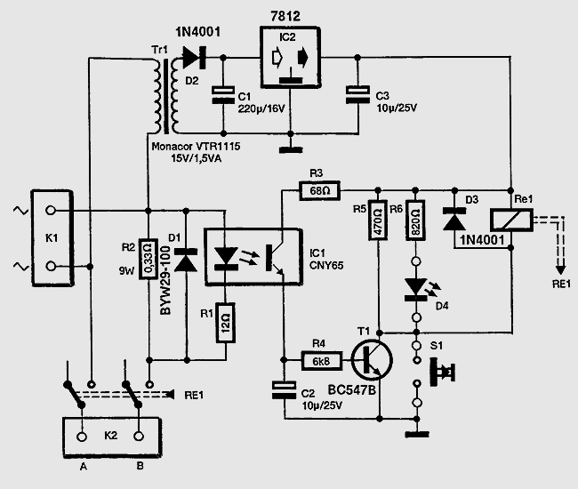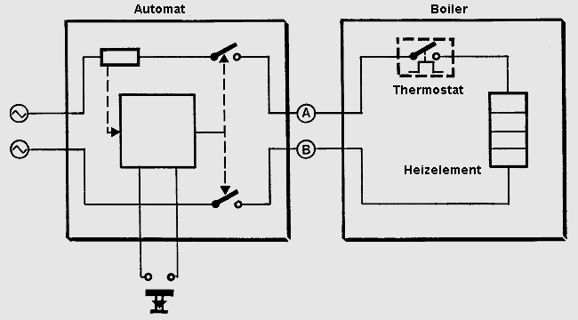 Die in Altbauwohnungen oftmals anzutreffenden Untertisch-Heisswasser-Boiler zeichnen sich nicht gerade durch sparsamen Umgang mit Energie aus. Sie halten nämlich das darin befindliche Wasser dauerhaft heiss, auch wenn man es lange nicht benötigt. Den Boiler mit einem gewöhnlichem Netzschalter nach Gebrauch wieder auszuschalten, ist aber nicht sinnvoll, denn wer denkt schon immer an das Abschalten… Viel besser ist es den Boiler auf Knopfdruck einzuschalten, während die Elektronik nach einigen Minuten das Gerät dann automatisch wieder ausschaltet. Auf den ersten Blick scheint ein monostabiler Multivibrator die geeignete Lösung. Allerdings berücksichtigt ein solcher Multivibrator nicht die Temperatur des Wassers, das aufgeheizt werden soll. Besser als eine feste Zeitkonstante ist es, das Verhalten des Thermostates des Boilers auszuwerten. Solange die Wassertemperatur nicht den erforderlichen Wert erreicht hat, schiesst der Thermostat den Stromkreis durch das Heizelement. Erst bei der Solltemperatur öffnet der Thermostat und schliesst erst, wenn die Wassertemperatur wieder den eingestellten niedrigeren Schwellwert unterschreitet. Diese Regeleigenschaften macht sich unsere Schaltung zunutze. Ob der Thermostat geschlossen ist oder nicht, lässt sich durch einen Shunt-Widerstand (R2) feststellen. Funktionsweise: Ein Druck auf S1 startet die Automatik, indem der Taster das Relais betätigt, welches wiederum K1 mit K2 durchschaltet. Auch wenn man den Taster loslässt, bleibt das Relais angezogen. Grund dafür ist besagter Shunt, an dem eine Spannung abfällt, die ausreicht, um die LED im Optokoppler IC1 zu aktivieren. Während der negativen Halbwellen schliesst D1 übrigens den Shunt kurz, so dass die maximal erlaubte Sperrspannung der Optokoppler-LED nicht überschritten wird. Auf der galvanisch getrennten anderen Seite des Optokopplers leitet der Fototransistor, so dass sich C2 über R3 recht schnell aufladen kann. Wenn der Kondensator geladen ist, ist die Basisspannung von T1 hoch genug, damit der Transistor leitet. Da T1 parallel zu S1 geschaltet ist, erfüllt er auch die gleiche Funktion, nämlich das Relais zu aktivieren und den Boiler in Heizstellung zu halten. Erst wenn die Wassertemperatur erreicht ist, öffnet der Thermostat und sorgt dafür, dass der Boiler keinen Strom aufnimmt. Die Spannung über dem Shuntwiderstand sinkt, so dass der Fototransistor sperrt und sich C2 langsam über R4, T1 und sich selbst entlädt. Das Relais fällt ab und der Boiler wird abgeschaltet, bis ihn ein erneuter Druck auf S1 wieder startet. Bei Aufbau und Inbetriebnahme des Boiler-Automaten müssen selbstverständlich alle Regeln im Umgang mit der 230V-Netzspannung beachtet werden. Dies bedeutet, dass ein Griff auch in die galvanisch getrennte Elektronik tödliche Folgen haben kann, wenn der Automat mit dem Netz verbunden ist. Die Schaltung muss auf einer geätzten Platine, keinesfalls auf Lochraster aufgebaut werden. Das angegebene Relais kann 16A schalten und ist deshalb für alle Haushalts-Boiler geeignet. Wenn Sie die in der Stückliste angegebenen Bauteile verwenden, passt alles wunderbar in ein Stecker-Gehäuse mit Schuko-Dose. Der Schutzleiter muss direkt von Stecker zur Buchse durchverbunden werden. Eine allerletzte Bemerkung zu R2: Der angegebene Wert von 0,33 Ohm ist für einen Boilerstrom von 5 A festgelegt. Zieht der Boiler weniger Strom, ist der Widerstand zu vergrössern, bei leistungsstärkeren Boilern zu verkleinern. Da der Spannungsabfall über R2 1,65 V betragen muss, damit der Optokoppler aktiviert wird, berechnet man beispielsweise für einen 7,5A-Boiler R2 = 1,65 V/7,5 A = 0,22 Ohm. Die Verlustleistung steigt natürlich entsprechend auf gut 12 W. |