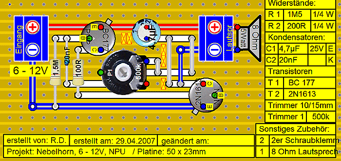 An einen freien Kanal des Fernsteuerempfängers angeschlossen, wird das Nebelhorn ein- und ausgeschaltet. Baut man den Lautsprecher an günstiger Stelle des Modells ein (Resonanzraum), dann wirkt der Klang noch "echter". – Die Bauteile für das Nebelhorn kann man u.a. bei Reichelt bestellen.