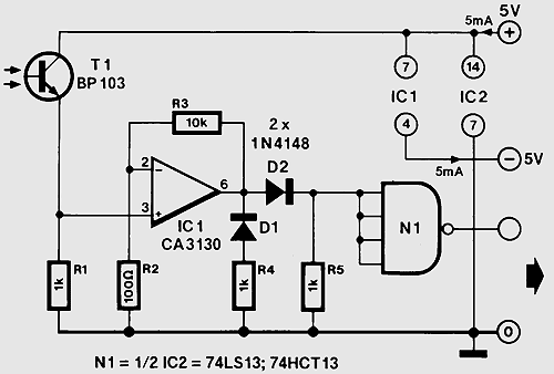 Der grösste Unterschied zwischen Mensch und Computer ist, dass der Mensch Sinnesorgane hat, mit denen er die Umwelt wahrnehmen kann: Temperatur, Helligkeit, Wind usw. – Wenn man einem Computer ermöglichen möchte, wenigstens einen Teil seiner Umgebung andeutungsweise wahrzunehmen, dann muss man ihm ein digitaltaugliches Sinnesorgan verpassen. Dabei findet die Messung linearer Werte immer über eine Schnittstelle und einen A/D Wandler statt. Handelt es sich um einen 8bit Wandler, kann man Werte von 0-255 über die Messgrösse erhalten. Die hier beschriebene Schnittstelle ist praktisch eine Art "Sehender Computer". Zwar beträgt die Information nur ein Bit, damit kann der Computer aber bereits erkennen, ob es hell oder dunkel ist. Eine praktische Anwendung für diese kleine Schaltung ist zum Beispiel die Messung von Sonnenstunden in einer Wetterstation. Eine weitere Möglichkeit ist die Lichtsteuerung für eine Aussenlichtanlage eines Hauses. Der Computer erkennt, wann es dämmert und schaltet das Licht ein – auch wenn du in Urlaub bist. Auch als Helligkeits gesteuerte Nachtlampe ist die Schaltung einsetzbar. Der Aufbau ist simpel: Eine Lochrasterplatine reicht dafür. Als Betriebsspannung benötigt man +5V und -5V. Der Ausgang liefert TTL-Pegel und ist logisch 0 wenn es hell ist, also logisch 1 wenn es dämmert. Die Empfindlichkeit der Schaltung kann man verändern, wenn statt R1 ein 10k Poti in Reihe mit einem 270 Ohm Widerstand geschaltet wird.