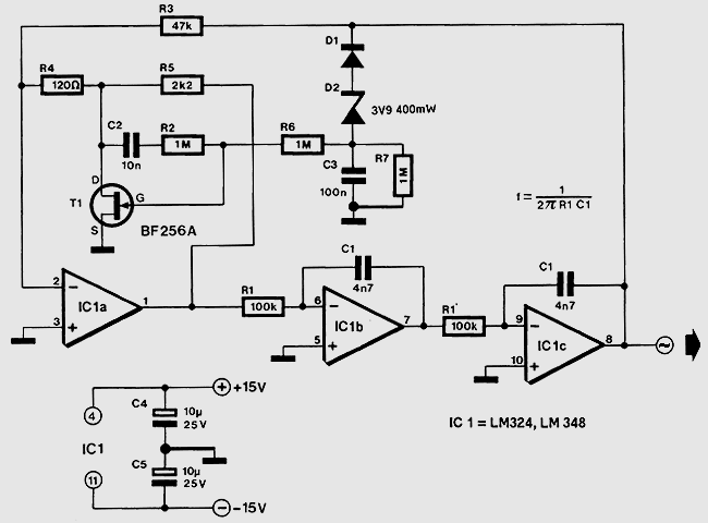 Frequenz kann einstellbar gemacht werden, indem für R1 und R1′ ein Tandempotentiometer verwendet wird. Um die Frequenzeinstellung zu erleichtern, sollte der Einstellbereich des Potentiometers auf eine Dekade beschränkt werden. Die maximale Ausgangsfrequenz der abgebildeten Schaltung beträgt 5 kHz, der Klirrfaktor ist kleiner als 0,1 %. Die Stromaufnahme beträgt nur wenige Milliampere. Anstelle des Vierfach-OPs LM348 können natürlich die äquivalenten Einzel- Operationsverstärker vom Typ 741 oder ähnlich Verwendung finden.